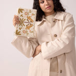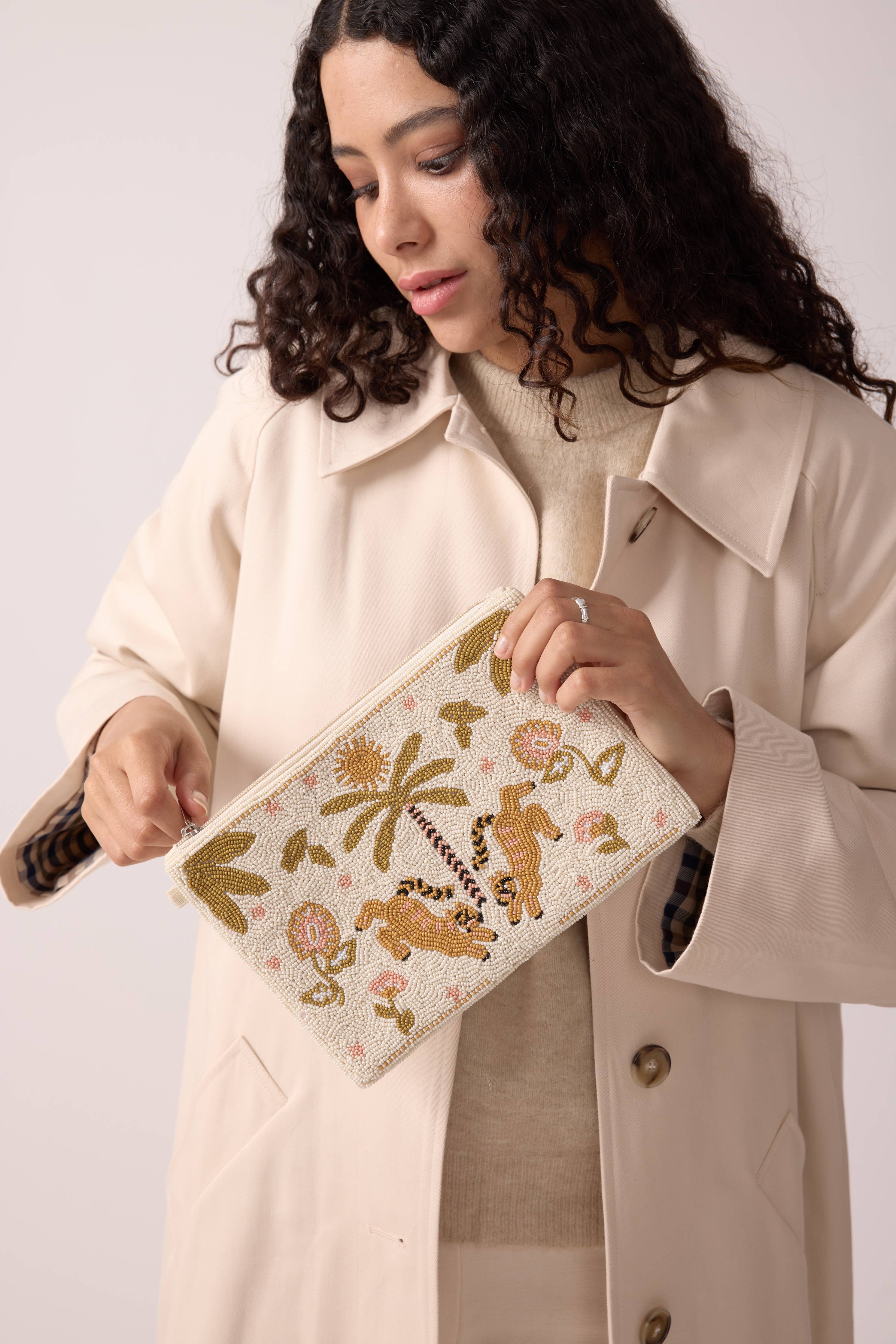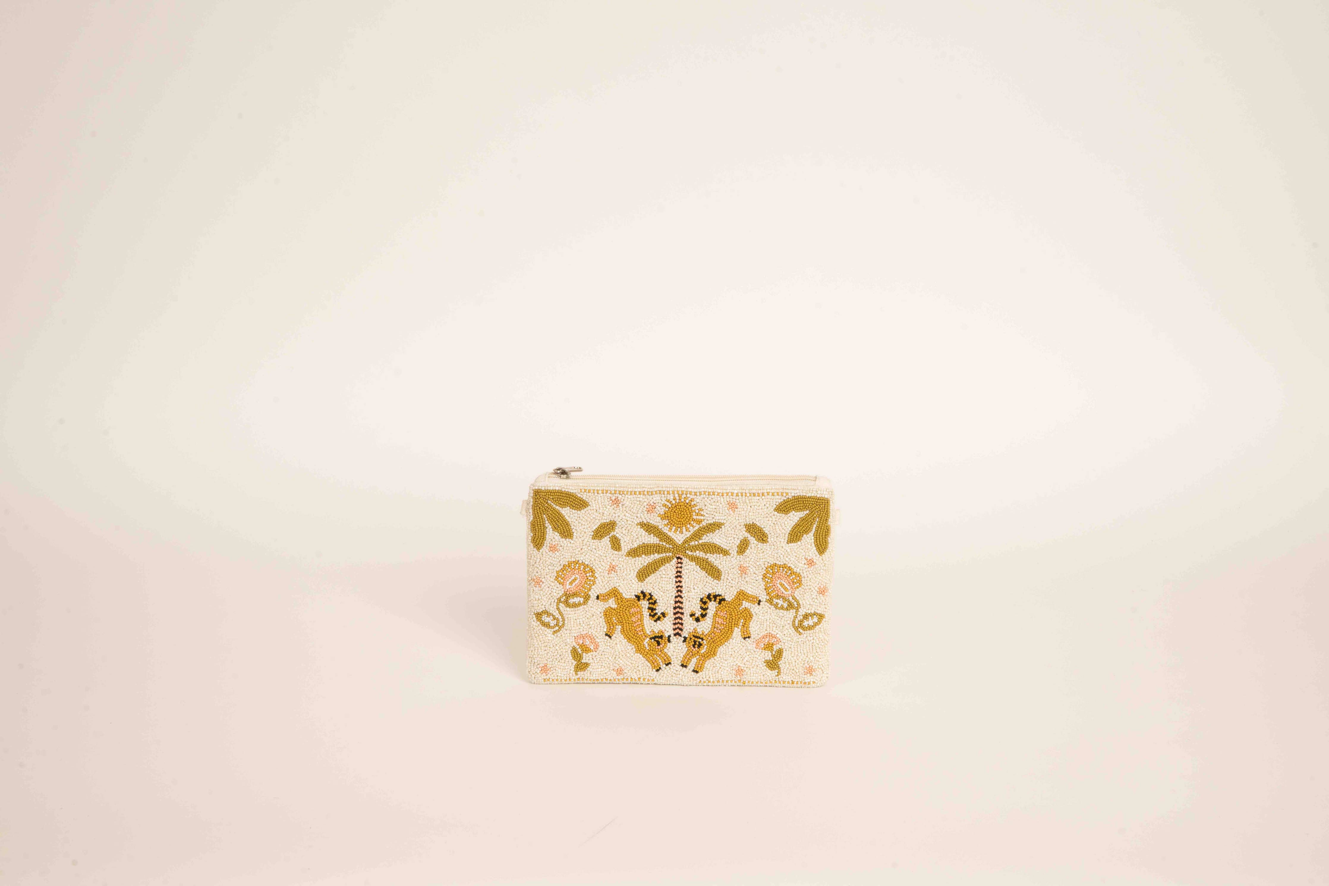 De AVA Bronze clutch is een uniek handgemaakt stuk, zorgvuldig geborduurd met kleurrijke kralen, als eerbetoon aan het iconische motief Tiger in the Palmeraie. Gemaakt van geborduurd katoen (oorsprong: India), combineert het elegantie, vakmanschap en originaliteit.