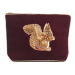 Dit charmante middelgrote tasje heeft een schattige gouden eekhoorn op een diep bordeauxrood fluweel. Hoogte 125 mm x Lengte 180 mm x Diepte 45 mm