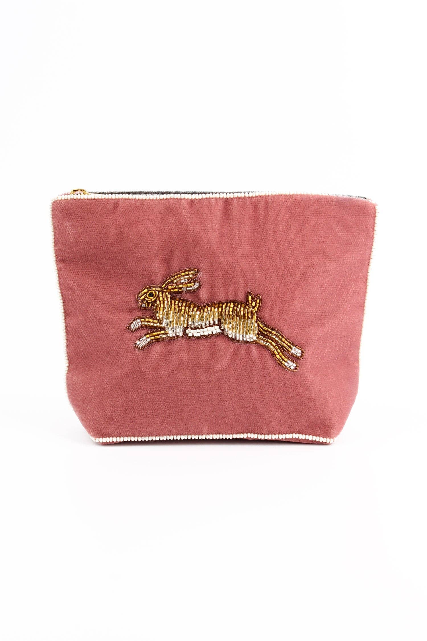 Perfect voor dierenliefhebbers, onze speelse kleine hazenbuidel is een must-have dit seizoen. Gemaakt van prachtige gouden en bronzen kralen op stoffig roze fluweel.