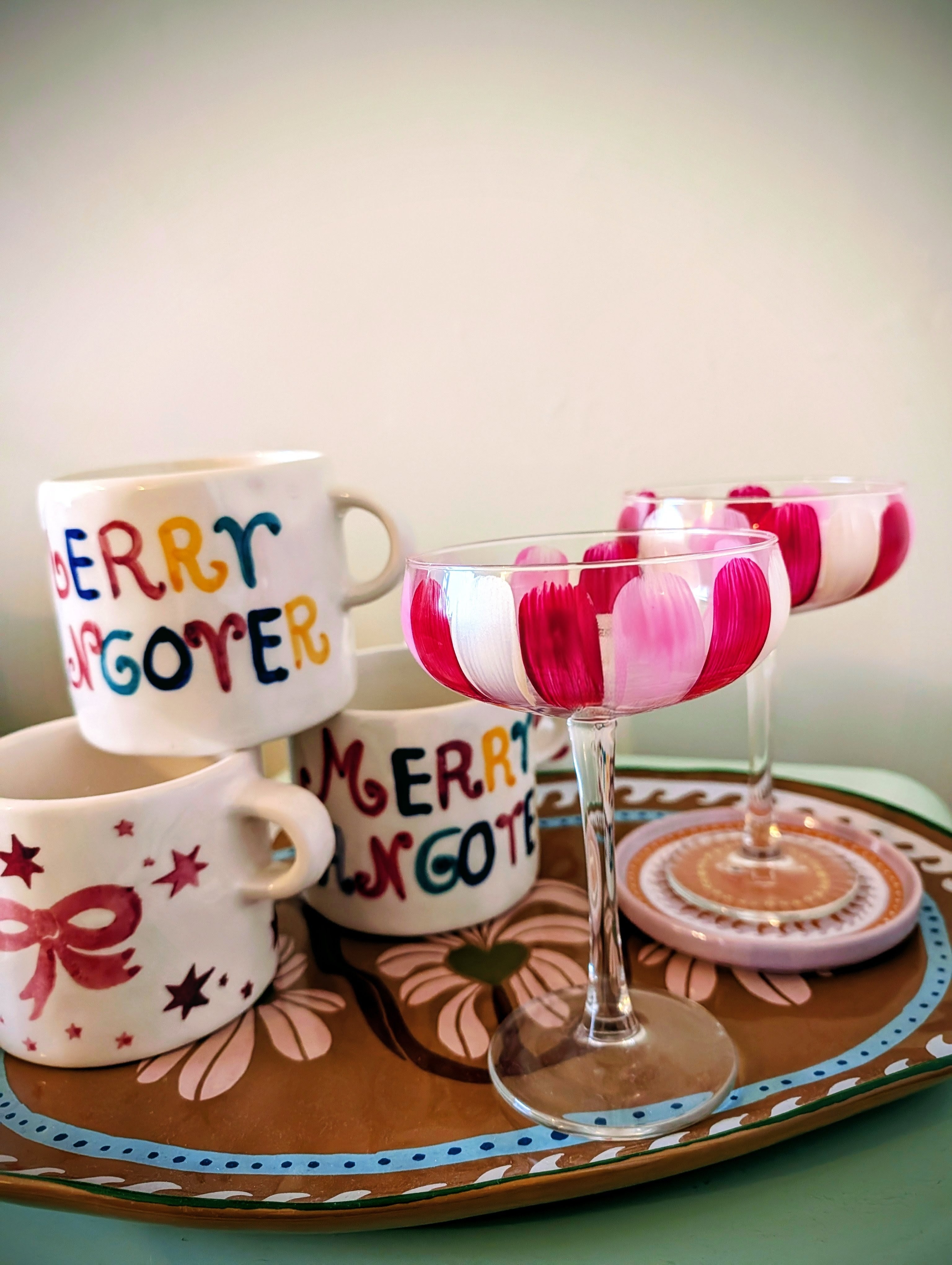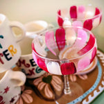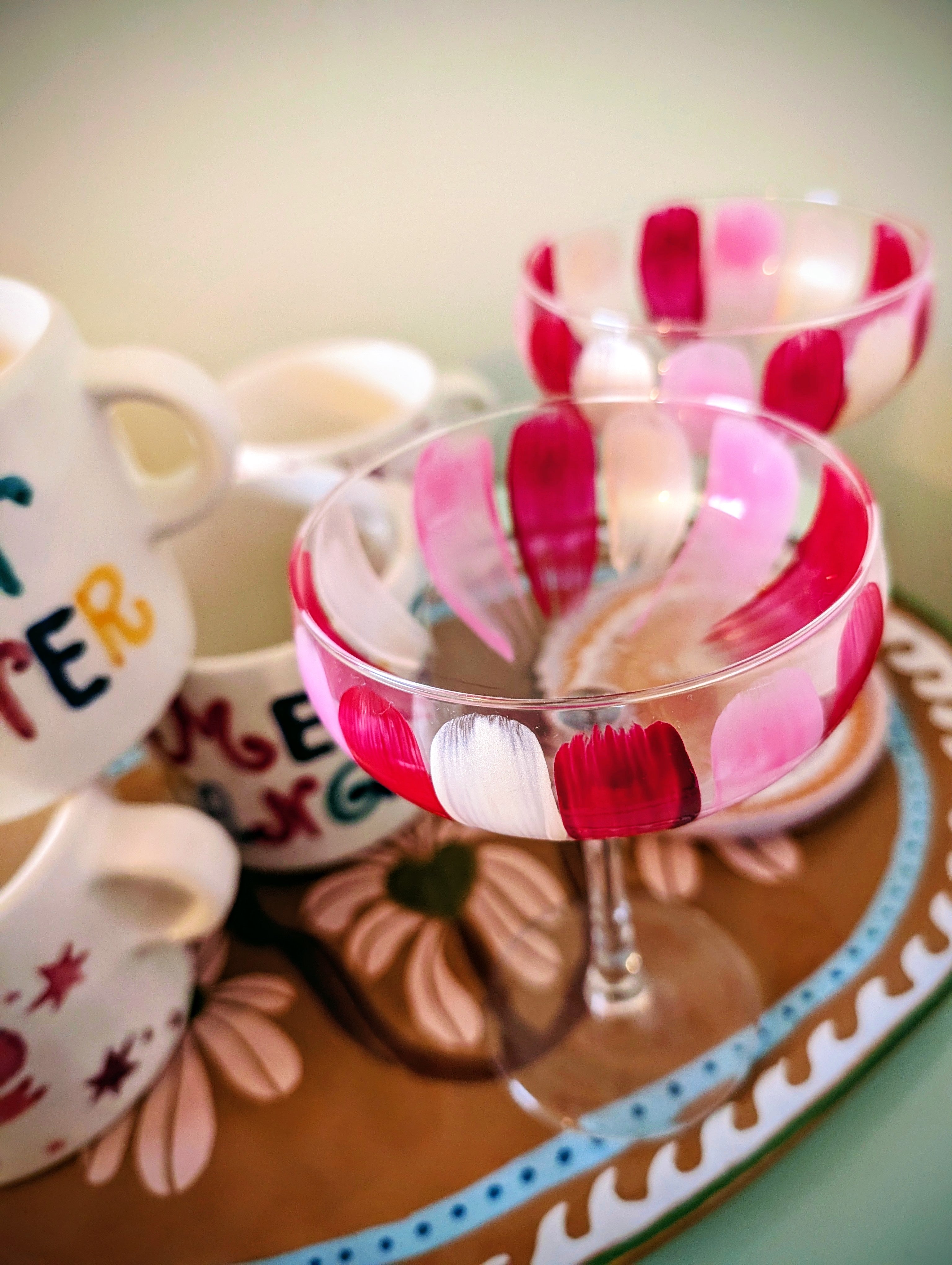 Handbeschilderde cocktailglazen. Afwasbaar met de hand. Mag in principe in de vaatwasser, maar voor langere houdbaarheid van het glas liever met de hand afwassen. LET OP! Dit product kan enkel afgehaald worden in de winkel. Geen verzending mogelijk.
