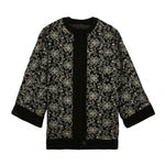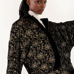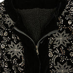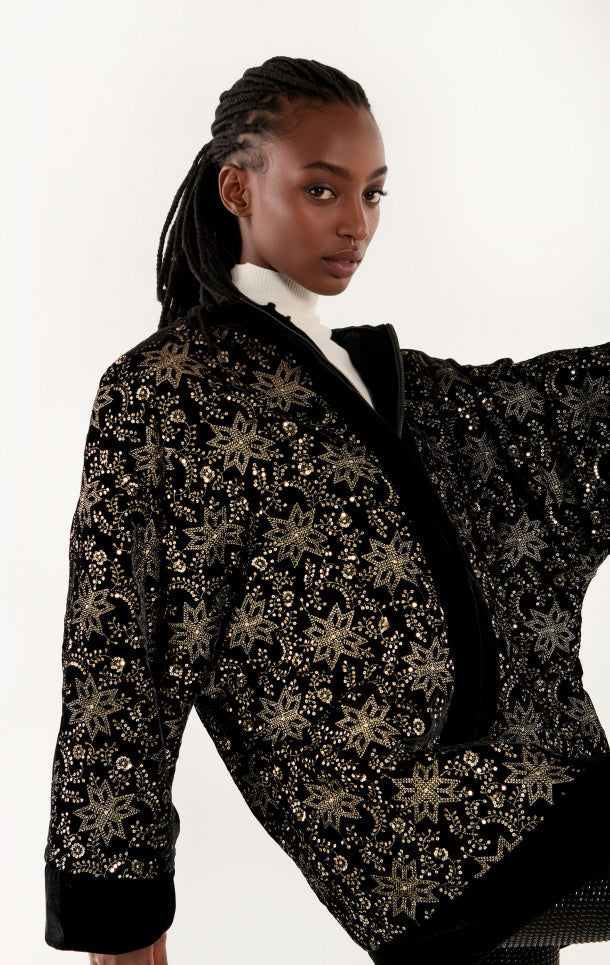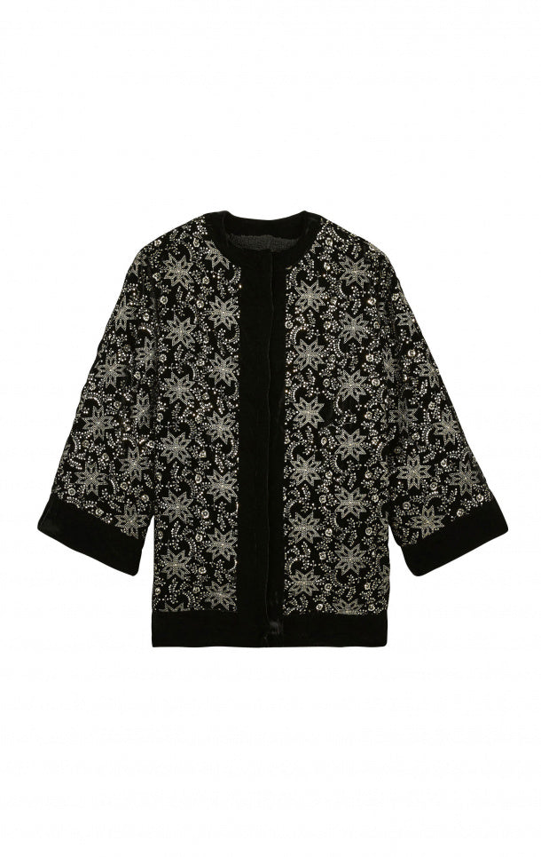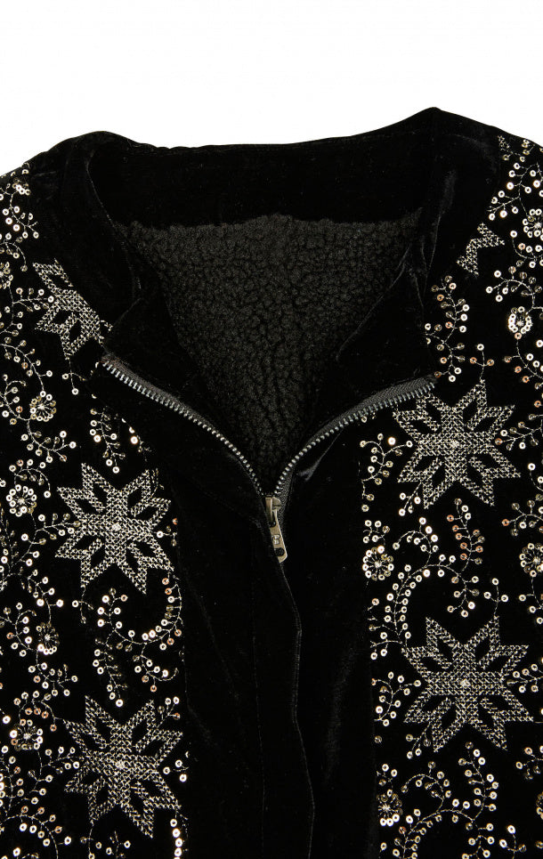 Zwart fluwelen jas afgewerkt met zilveren borduurwerk en pailletten.