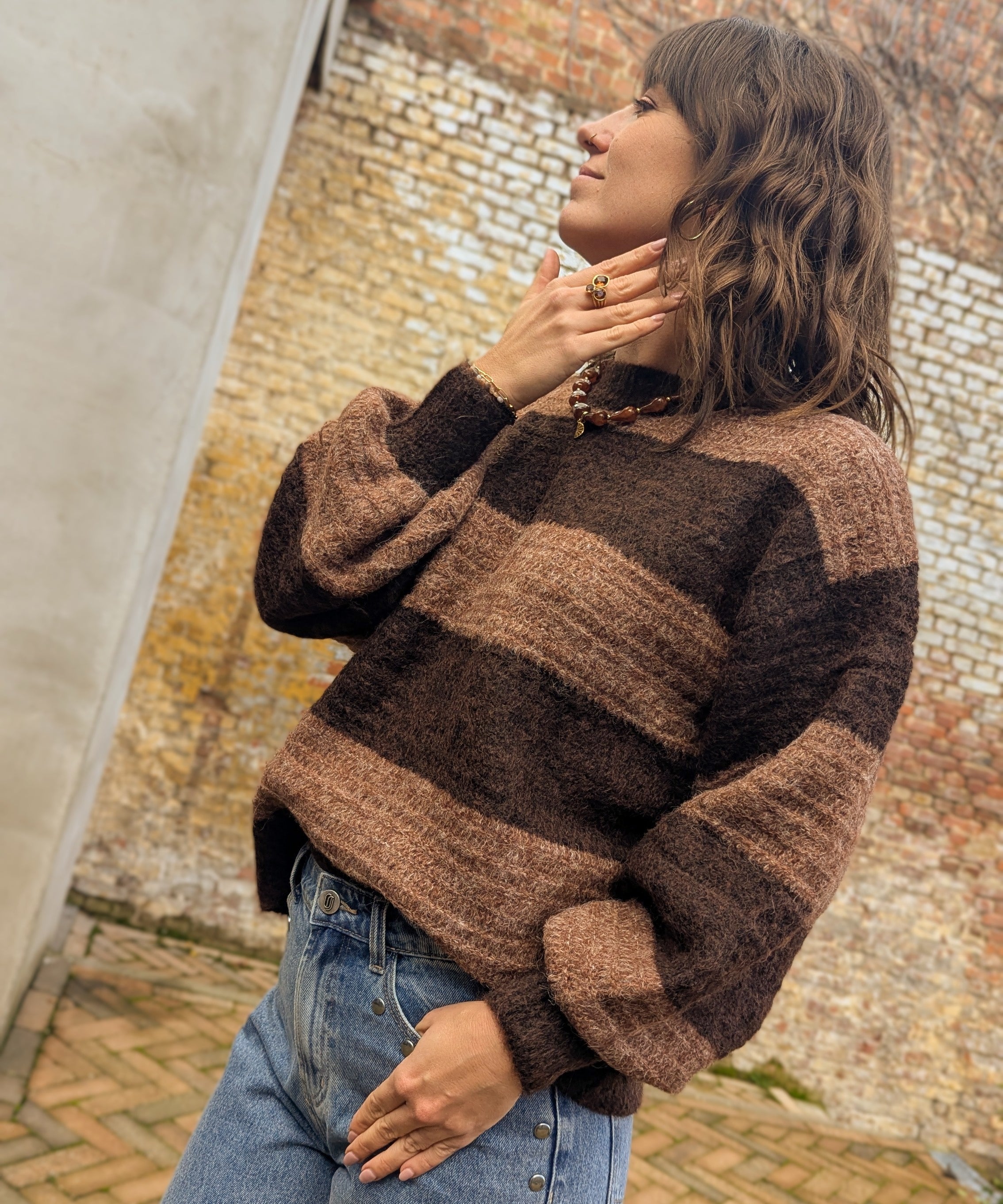 Gestreept shirt met pofmouwen en knoopsluiting voor dames SP068: Bruine strepen / L
