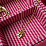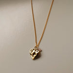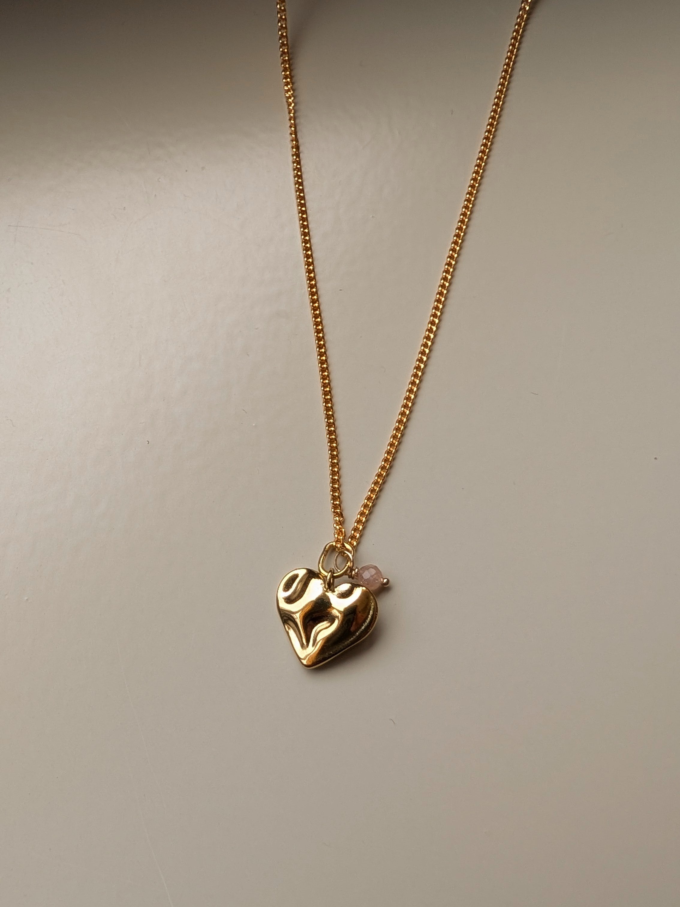 Een glanzend, organisch gevormd hartje in goud met naast zich jouw persoonlijke geboortesteentje: een klein halfedelsteentje dat volgens de sterren bij jouw geboortedatum past. Zo wordt jouw ketting écht uniek – gemaakt speciaal voor jou in ons Hejmee-atelier.