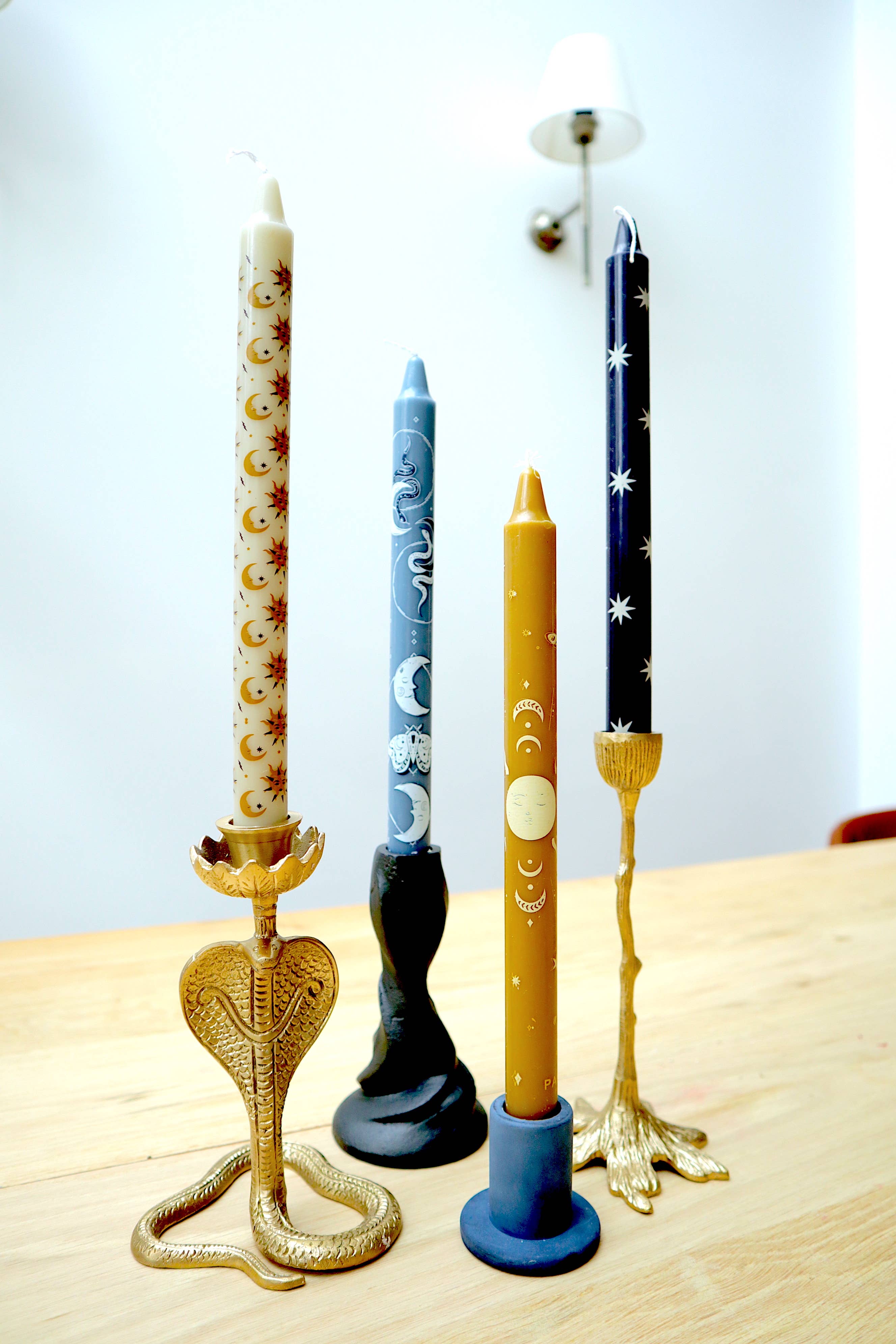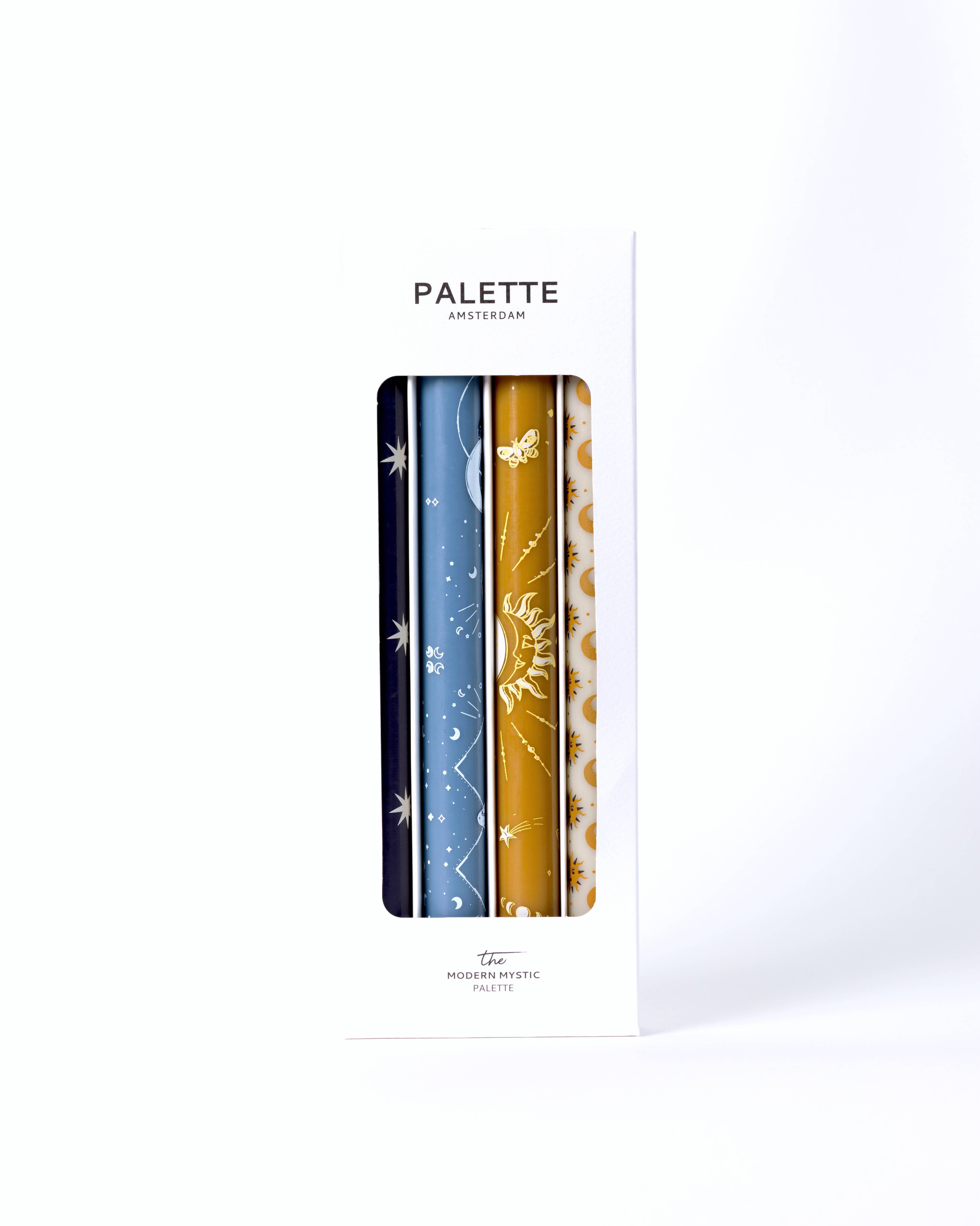 Met trots introduceren wij onze designinnovatie! Het Modern Mystic Palette is een set van vier, hoge, dinner kaarsen met exclusief ontworpen design prints in palet van lichtblauwe, diepblauwe, beige & gouden kaarsen, geïnspireerd door de magie van het universum, de sterren, maan & astrologie. Elke kaars heeft een andere print design van wax. Gezamenlijk staan ze meteen prachtig in zowel de winkel, als thuis! KWALITEIT - De kaarsen zijn roetarm en emissiearm. Ze branden 9-10 uur netjes, zijn 25 cm hoog en passen in bijna iedere kaarshouder. UNIEK ONTWERP - Ontworpen door Maxine in Amsterdam in onze kenmerkende set stijl en exclusief geproduceerd.