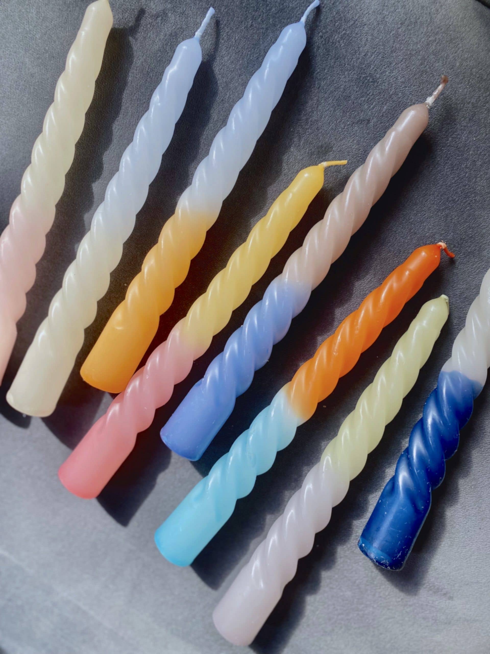 Sets of handmade candle palettes, all sets are unique. Price & package = set of 4 candles. NEW! Palette Amsterdam creates colorful dinner candles such as the highly popular twisted ; dip-dye candles and designer candles with prints and patterns on the candle! Each set is designed and sold as a palette allowing your shop and customers to create an atmosphere or mood that suits their interior with just one set. QUALITY - The candles are low-soot and low-emission. They burn slowly for 7-8 hours, quietly and without dripping. They are 17,5cm in height and fit in almost every chandelier. HAND DIPPED - In a Pantone-certified, unique color palette.