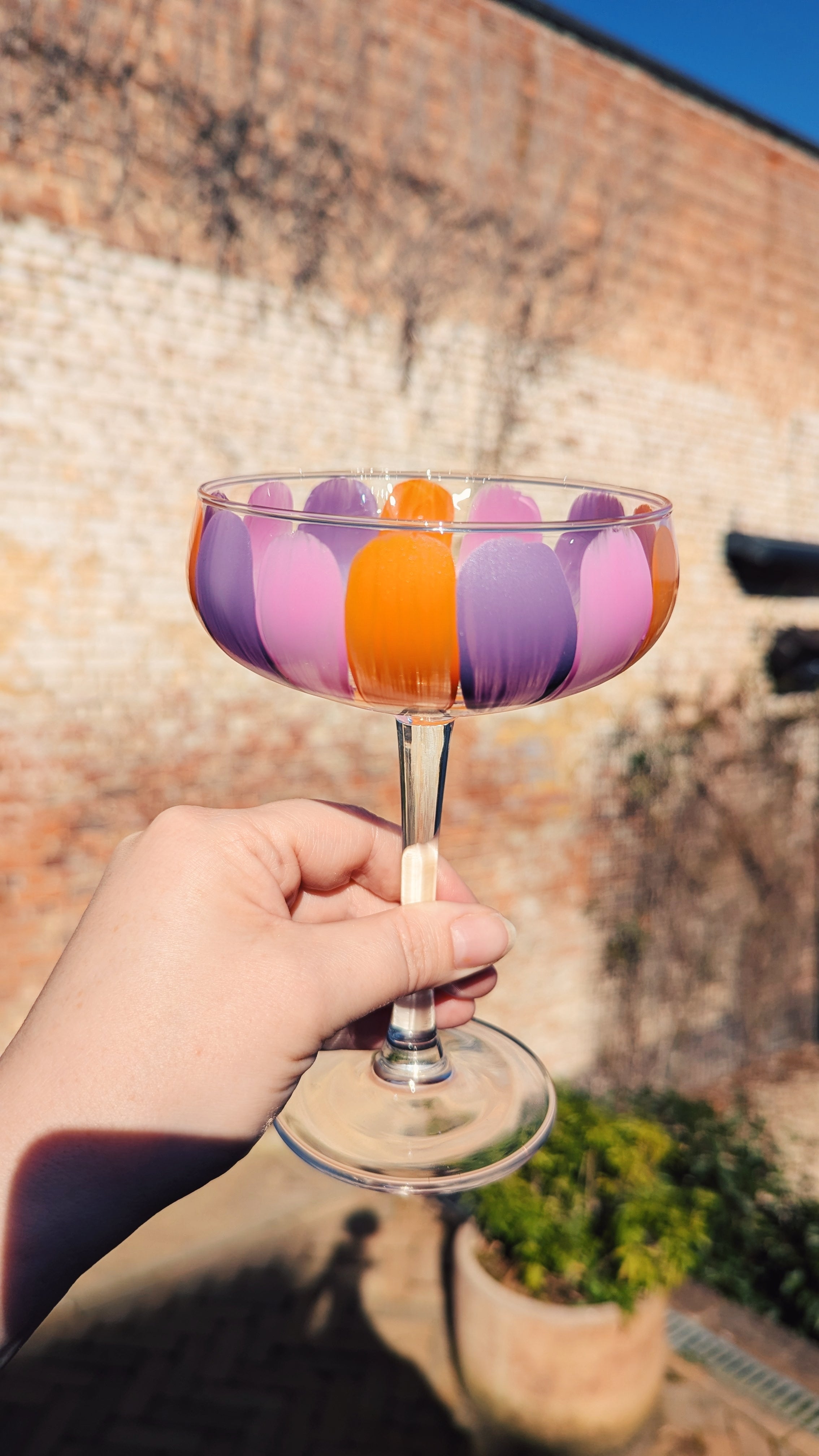 Handbeschilderde cocktailglazen. Afwasbaar met de hand. Mag in principe in de vaatwasser, maar voor langere houdbaarheid van het glas liever met de hand afwassen. LET OP! Dit product kan enkel afgehaald worden in de winkel. Geen verzending mogelijk.