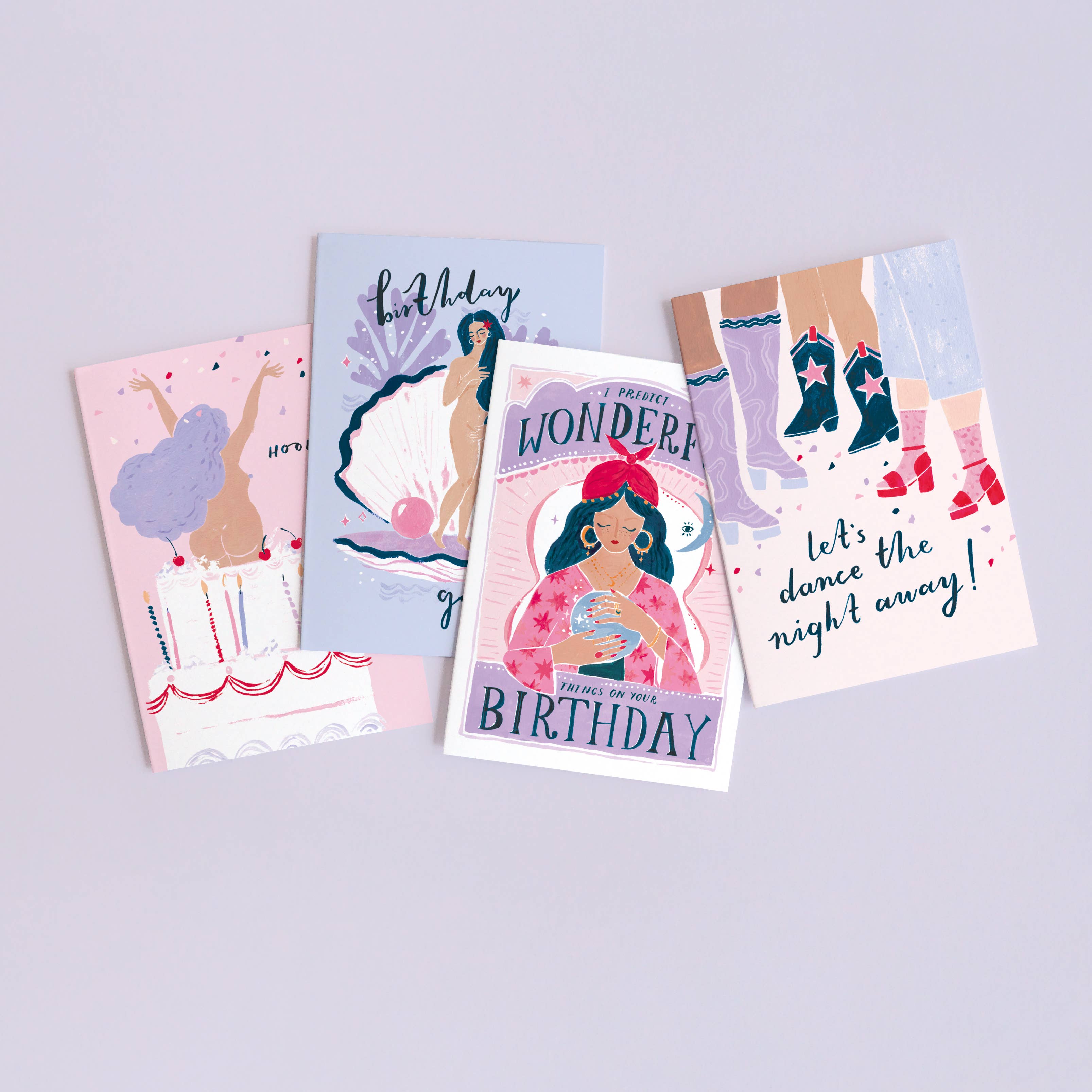 Deze verjaardagskaart maakt deel uit van de Venus-collectie en viert mooie lichamen en vrouwelijke vriendschappen. De feministische, brutale ontwerpen bevatten lichaamspositieve beelden in pastelroze, lila en rood, geïnspireerd op de Godin van Liefde en Schoonheid.