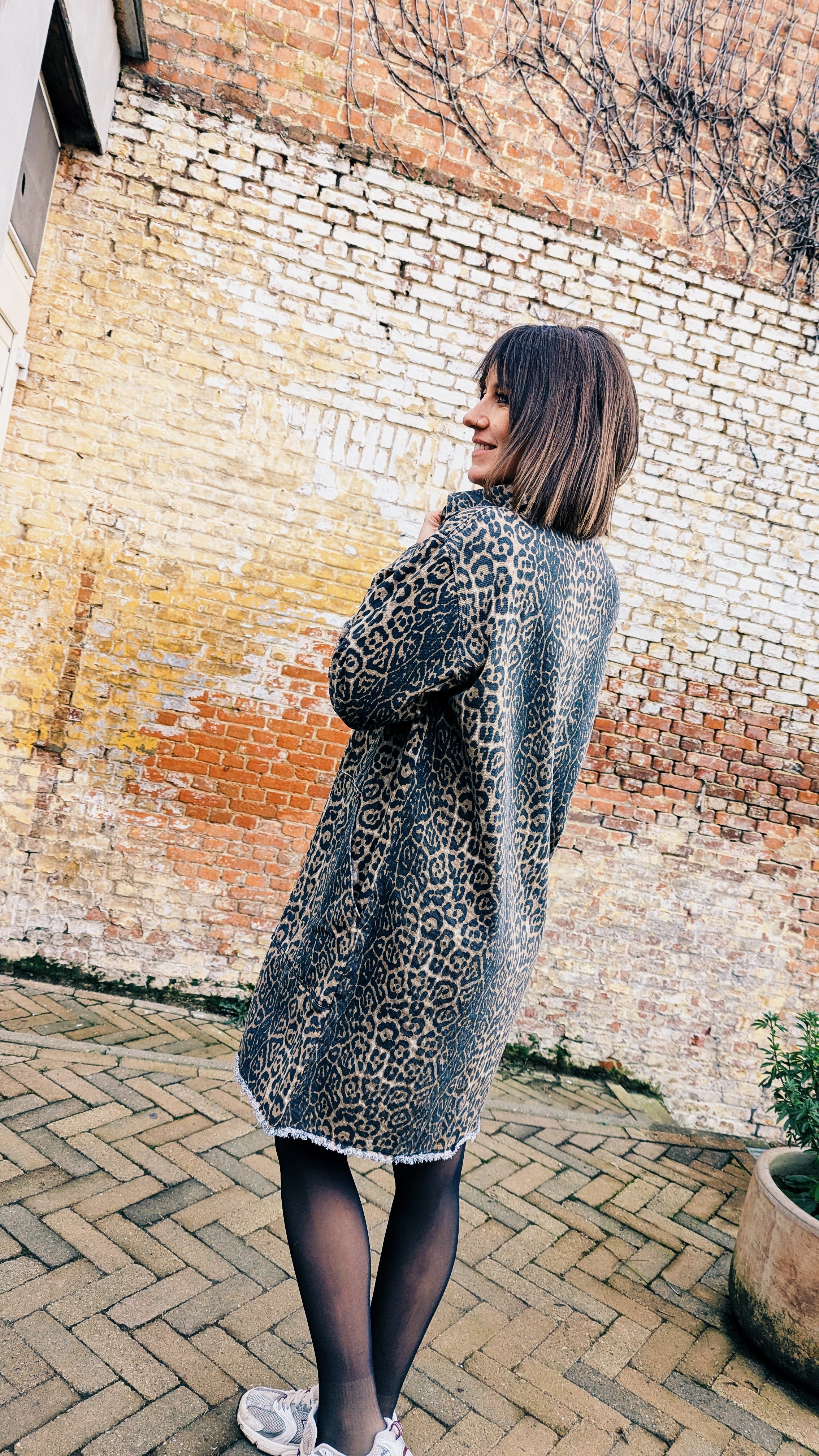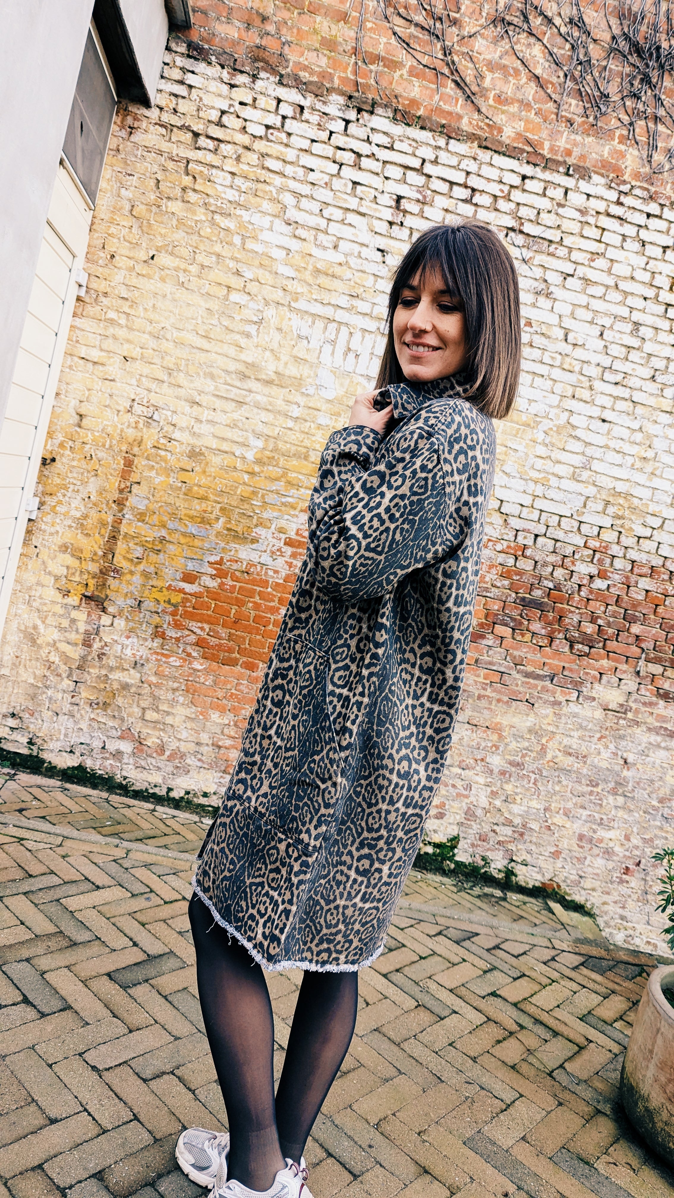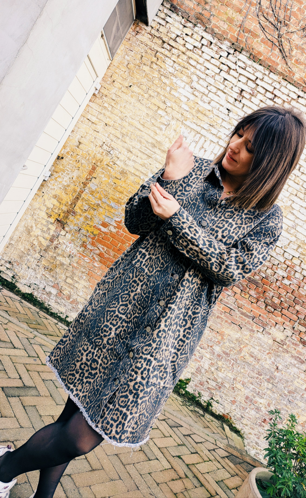 Raw denim vibes met een wilde twist! Deze leopard print jeansjurk is stoer, stijlvol en een echte eyecatcher.