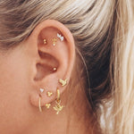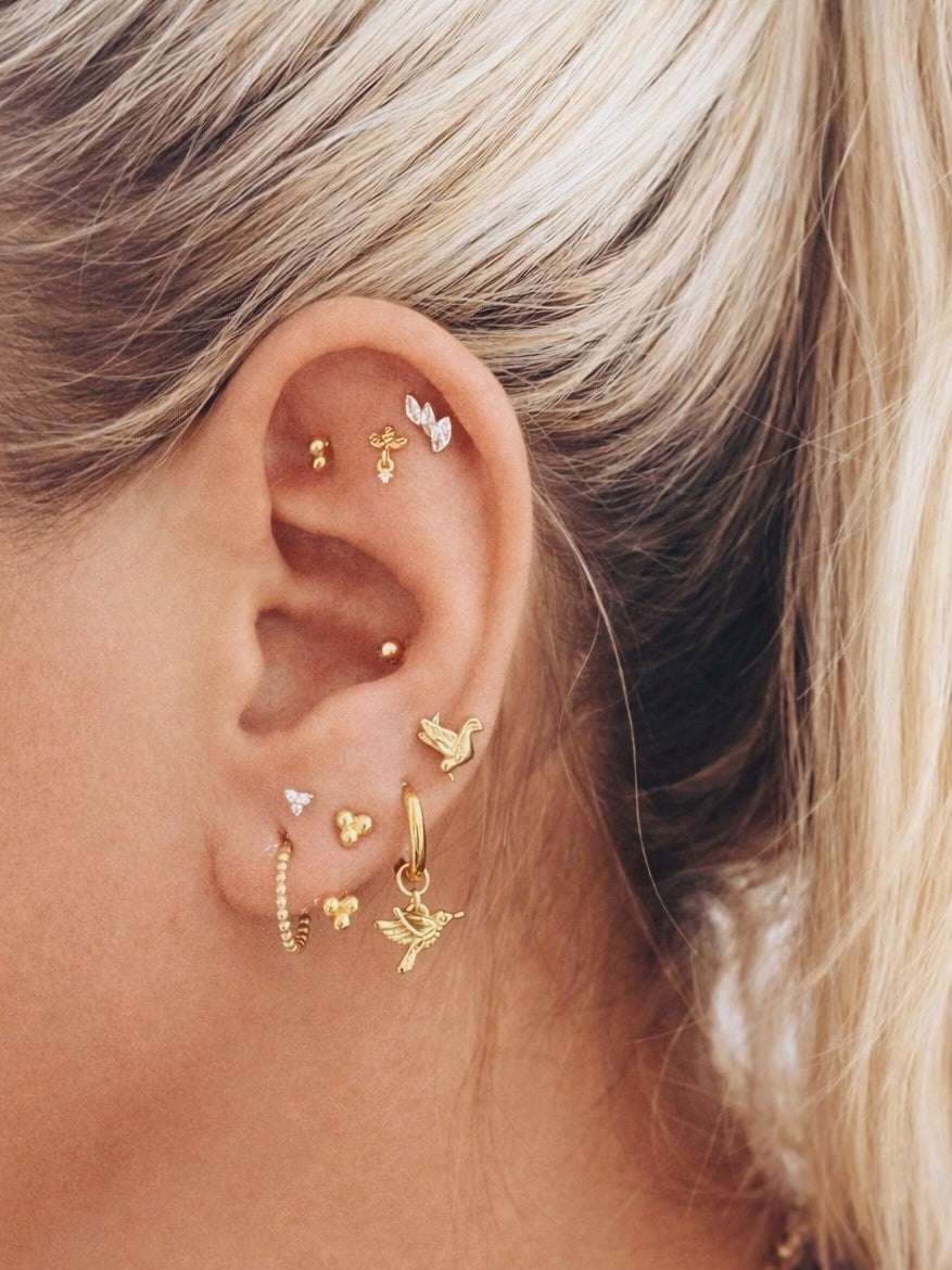De piercing is vervaardigd uit hoogwaardig titanium met goldplated afwerking, wat zorgt voor een warme gouden glans en een duurzame kwaliteit. Dankzij het labretstaafje 1,2 mm dik met interne schroefdraad zit deze piercing comfortabel en veilig, ideaal voor dagelijks dragen in alle piercingplekjes van het oor (afhankelijk van jouw styling).