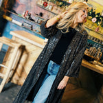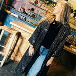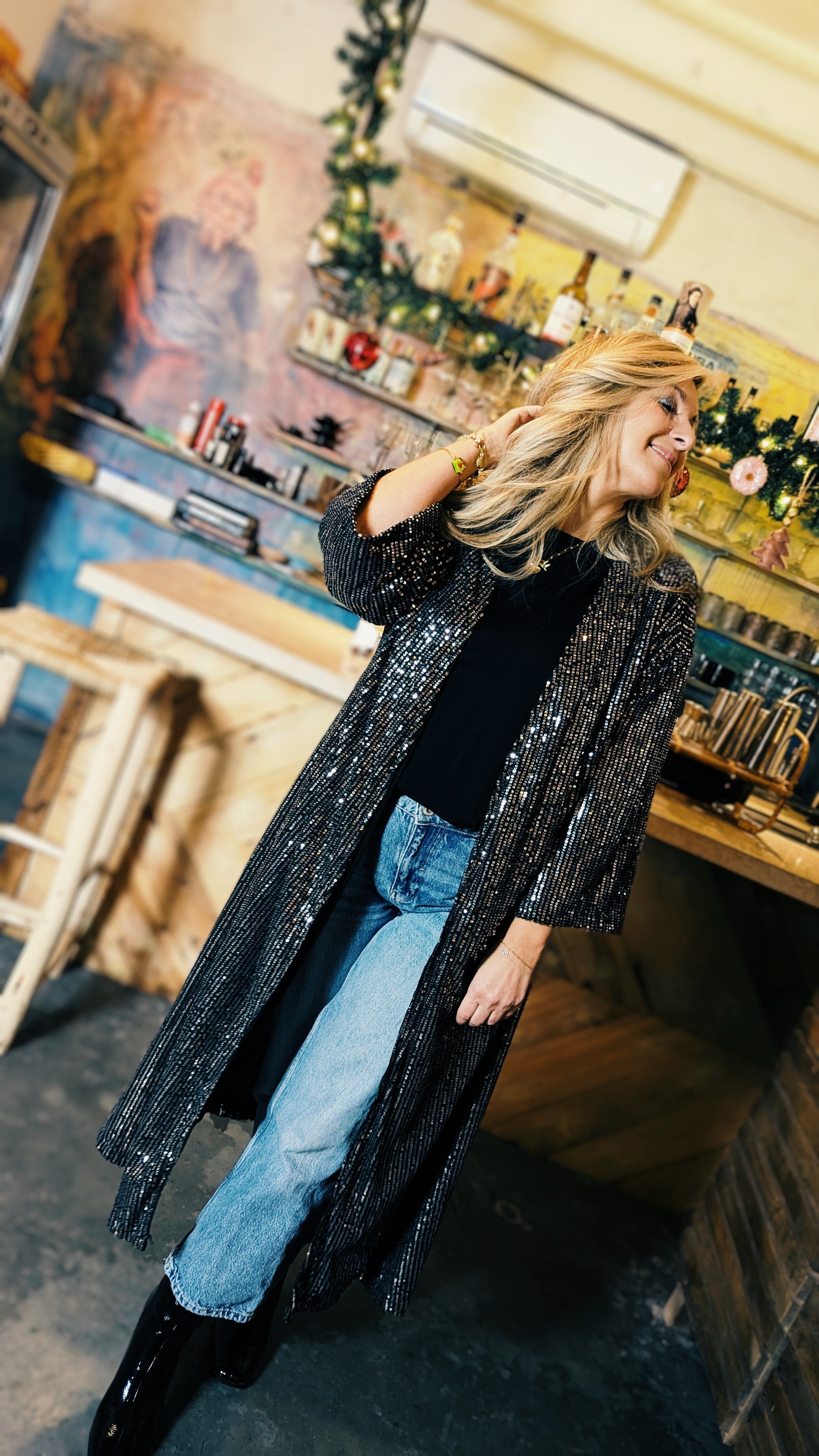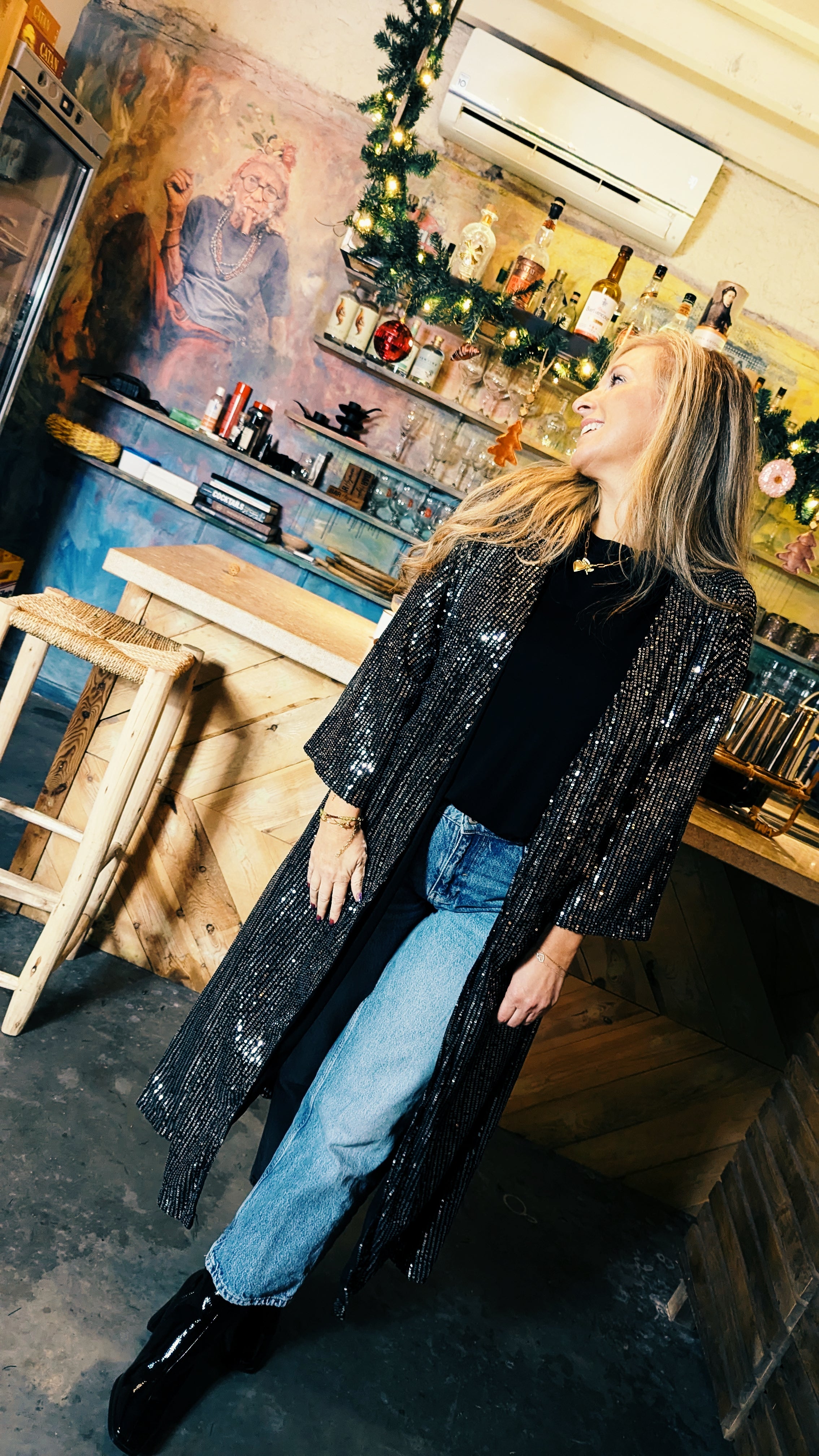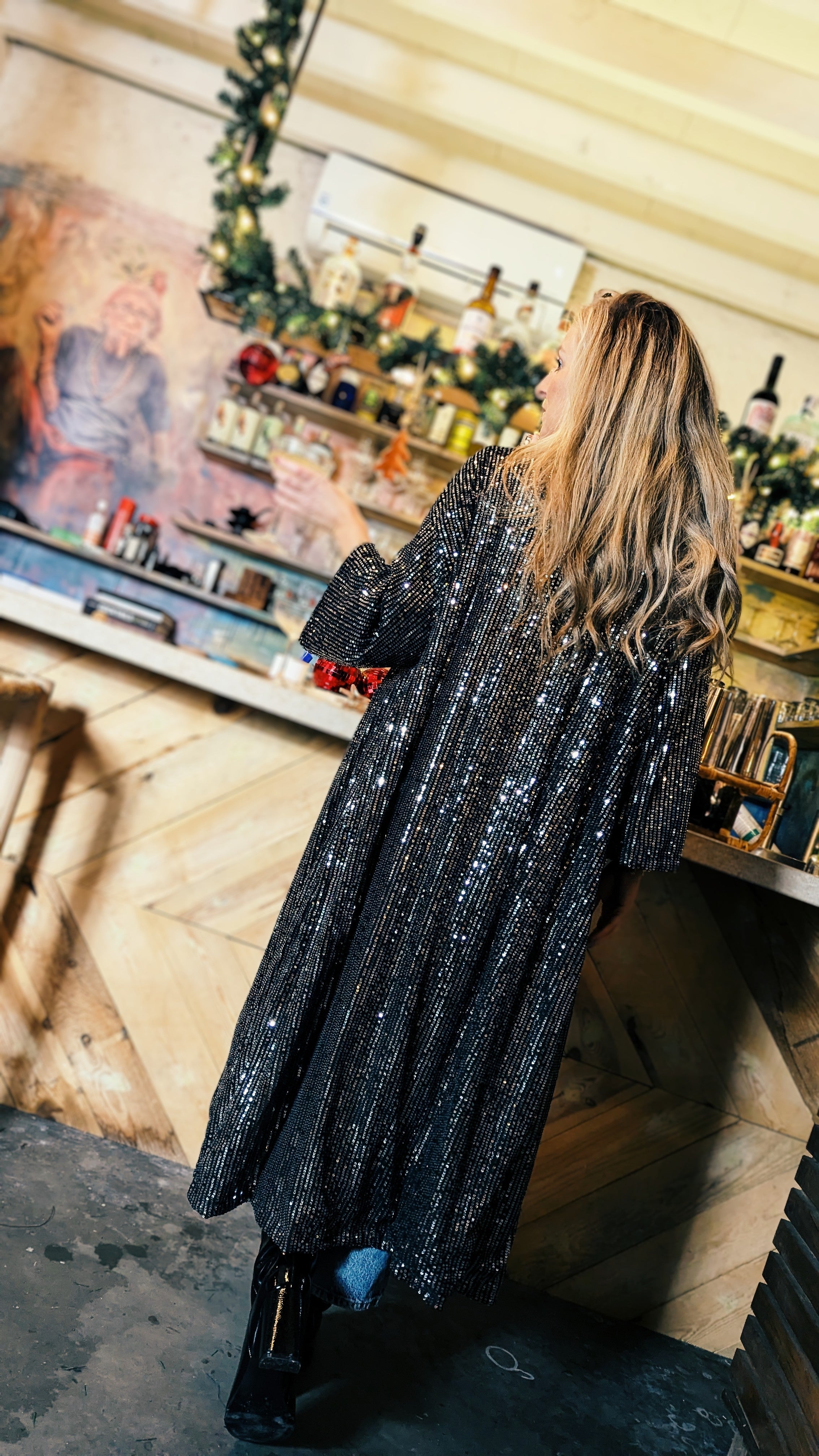 Deze prachtige zwarte glitter kimono komt in een one size die makkelijk tot maatje 44 gaat.