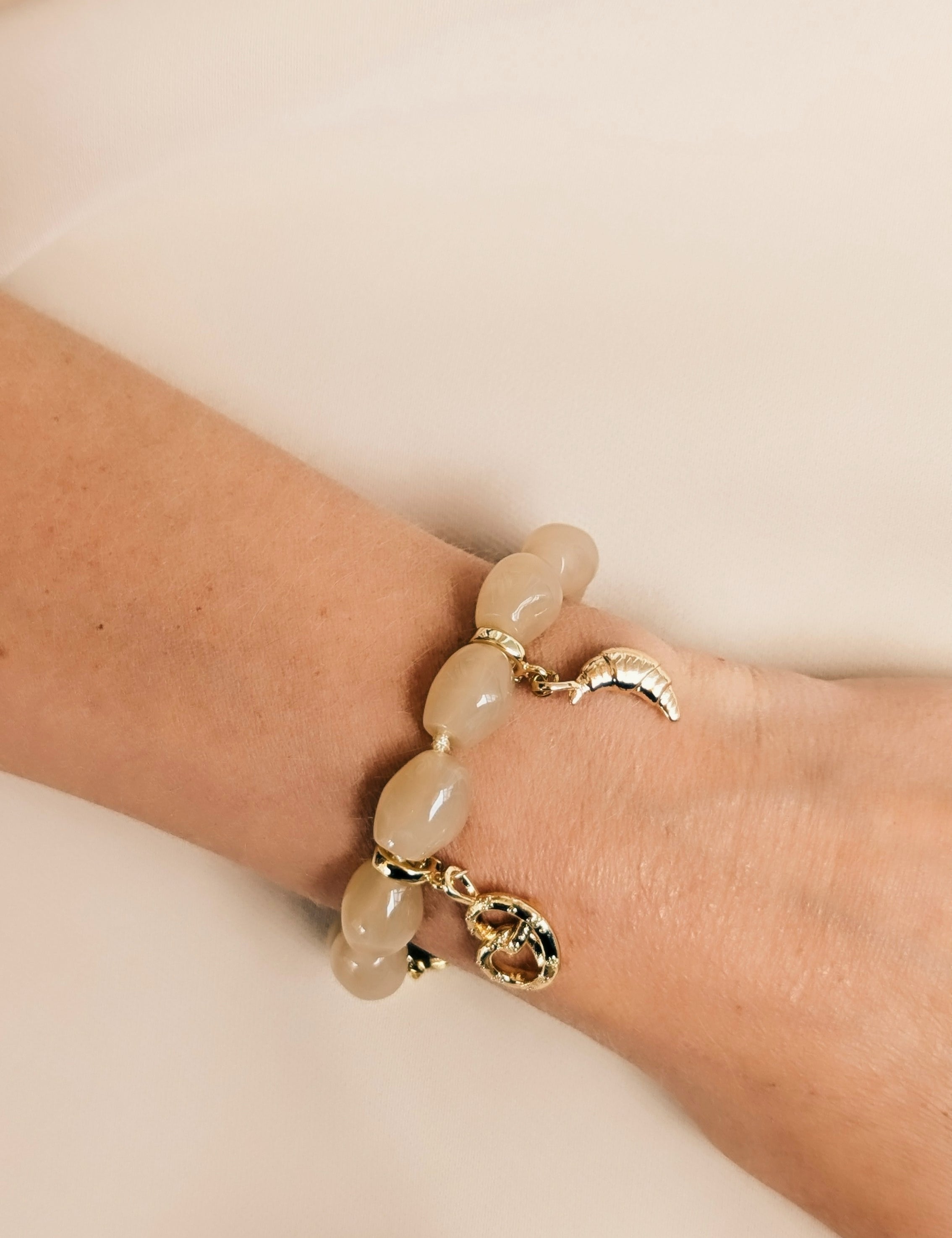 “Niets ontspannender dan een koffie date met mijn vriendinnen. Dus de croissant en pretzel bedel moest aan mijn kralenarmbandje! Ook leuk dat ik de bedels kan wisselen. De beige kralen passen echt bij elke outfit!